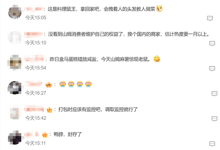 对于此次“麻薯盒内有活老鼠”的事件,网友评论除了玩梗之外,更多的是对山姆品控表示不满。