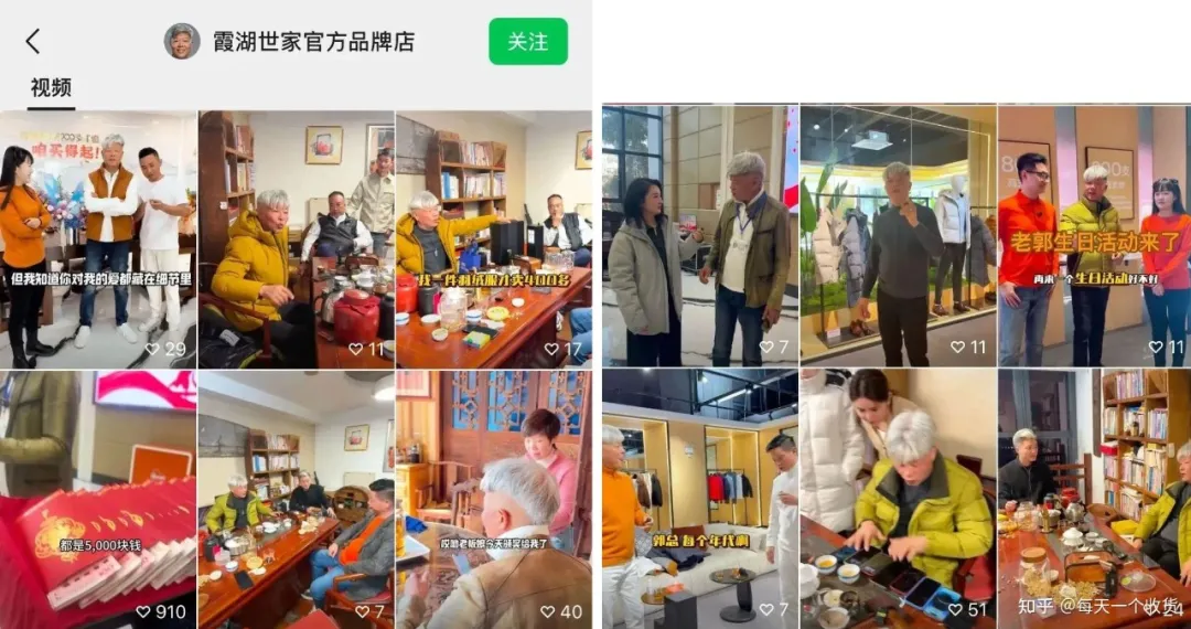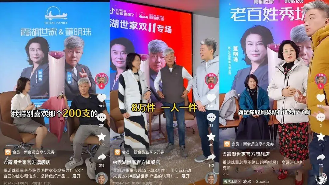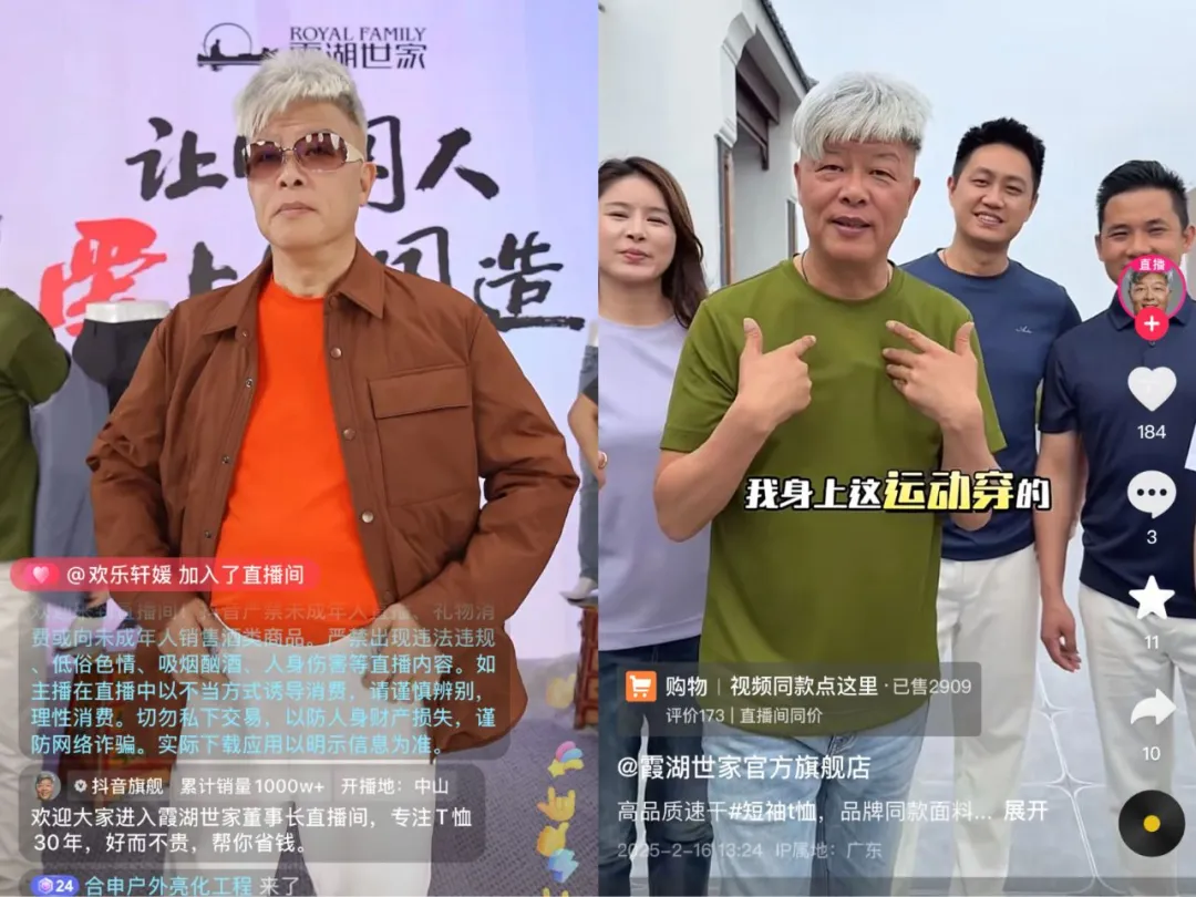 一头白发的郭长棋,每天早上7点就会出现在直播间,分享产品工艺、行业内幕,教消费者挑选面料、识别工艺等,朴实的分享引爆了流量,逐步转化为霞湖世家的产品销售。