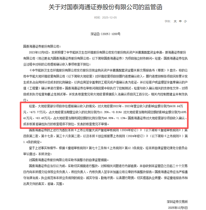 深交所认定,国泰海通对大地修复部分项目收入确认、成本核算准确性执行的核查程序不到位,发表的核查意见不审慎。