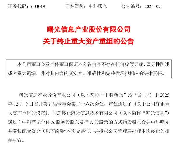 同日,海光信息也发布公告,公司于2025年12月9日召开公司第二届董事会第十七次会议审议通过了《关于终止换股吸收合并曙光信息产业股份有限公司并募集配套资金暨关联交易的议案》,同意公司终止通过向曙光信息产业股份有限公司(中科曙光)全体A股换股股东发行A股股票的方式换股吸收合并中科曙光并募集配套资金,并授权公司管理层办理本次终止相关事宜。