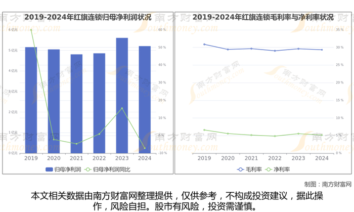 红旗连锁年报数据显示(如上图),2024年实现营业总收入101.23亿,同比增长-0.09%,近5年复合年增长率2.83%。