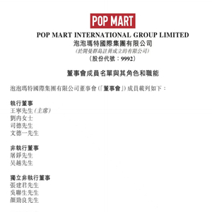 12月10日,泡泡玛特发布公告称,吴越先生已获委任为公司非执行董事,自2025年12月10日起生效。