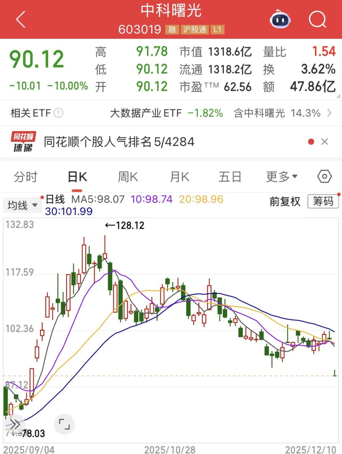 12月10日,在宣布终止与科创板芯片龙头海光信息(688041.SH)的千亿级合并计划后,服务器制造商中科曙光(603019.SH)开盘即封死一字跌停板,最终以90.12元的价格收盘,总市值应声缩水至1319亿元,单日市值蒸发约146亿元。