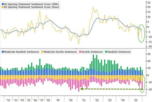 彭博利率策略自然语言处理模型显示,鲍威尔本月发布会的开场白比10月会议更显鸽派,且是自2021年以来最鸽派的表态。关注该模型的策略师Jersey指出,围绕资产购买的评论是推动这一转变的主要因素...