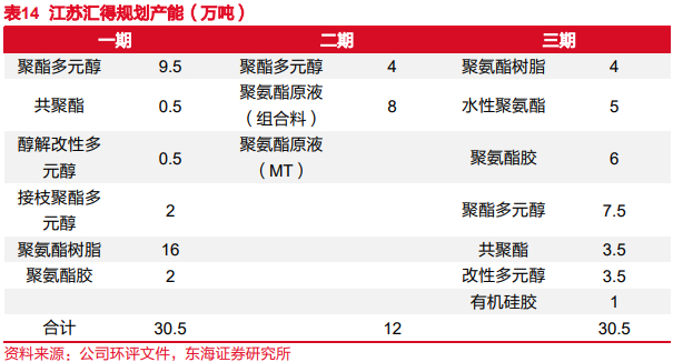 2025年8月公司发布《2025年度向特定对象发行A股股票募集说明书(申报稿)》,拟募集资金5.8亿元,用于建设“江苏汇得新材料有限公司年产30.5万吨聚氨酯新材料项目”。根据公司此前公布的环评文件,此次募投建设项目对应江苏汇得新材料公司一期项目,建设周期预计为12个月,13~24个月完成安装调试,项目整体在2029年达产。项目建成后将形成产能聚酯多元醇9.5万吨、共聚酯0.5万吨、醇解改性多元醇0.5万吨、接枝聚酯多元醇2万吨、聚氨酯树脂16万吨、聚氨酯胶2万吨,将丰富公司在各类聚氨酯改性材料的生产能力,更好地匹配下游企业需求,提高公司产品附加值。