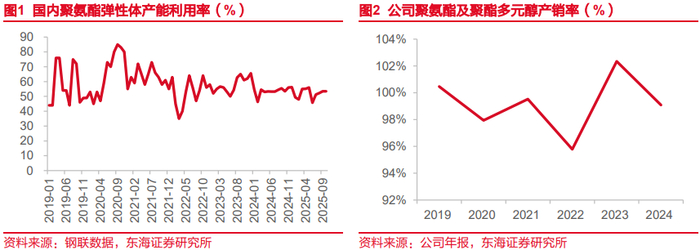 公司紧贴客户传统业务稳定成长:公司当前业务主要覆盖聚氨酯弹性体、革用聚氨酯、聚氨酯硬泡/软泡材料,及少量聚氨酯改性体。基于公司在聚氨酯领域具备丰富的产品与市场经验,公司主打差异化竞争策略,专注于与下游客户进行联动研发、配合生产,满足其定制化需求。公司革用聚氨酯产量占国内总产量的10.9%,市占率达到全国第四。2019~2024年,公司革用聚氨酯产销率始终保持在98%以上。
