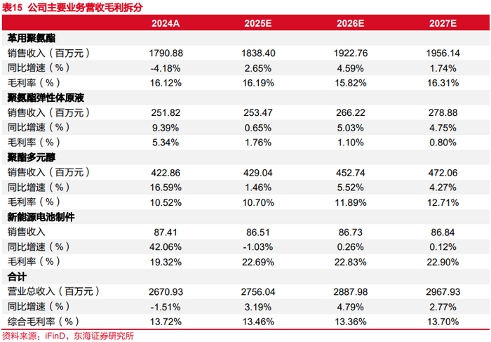 公司有望持续受益于国内新能源车产业增长:2022年~2025年1-10月,新能源车占国内汽车产量比重分别为26%、32%、41%、47%,是国内汽车产量增长最重要的驱动力。公司产品覆盖了较广性能指标的聚氨酯材料,在汽车上游原材料中覆盖了汽车内饰、座椅发泡材料、热熔胶、新能源电池用辅助材料等。根据测算,每辆新能源汽车可用聚氨酯材料规模大约在1000~3000元。目前很多国产新能源品牌生产商已是公司间接客户,预计公司仍将持续受益于我国汽车产业高速发展。