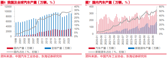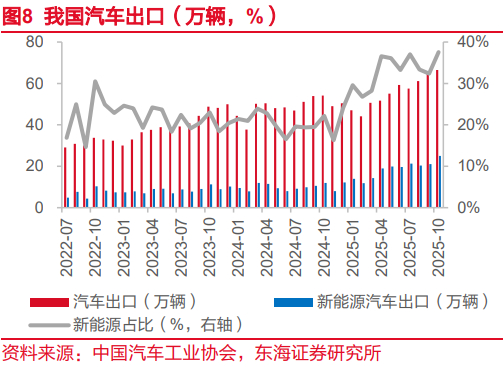从类别来看,2022年~2024年、2025年1-10月,新能源车占国内汽车产量比重分别为26%、32%、41%、47%,是国内汽车产量增长最重要的驱动力,这也预示着未来国内汽车生产将以新能源车辆为主。