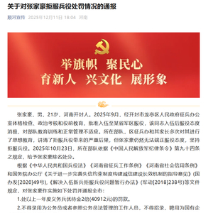 张家豪,男,21岁,河南开封人。2025年9月,经开封市龙亭区人民政府征兵办公室体格检查、政治考核和役前教育,批准入伍至某省军区服役,该同志入伍后服役态度消极,对部队教育训练和正常管理不适应。所在部队,区征兵办和其家长多次对其进行了思想教育,讲清了拒服兵役带来的严重后果,但张家豪仍然无法端正服役态度,坚持拒服兵役。2025年10月23日,所在部队依据《中国人民解放军纪律条令》第九十四条之规定,给予张家豪除名处分。