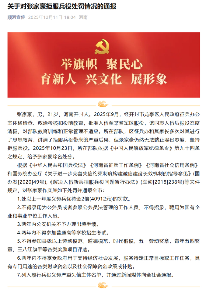河南开封21岁男子张家豪入伍后拒服兵役,被罚款40912元,不得录用为公务员,两年内不得参加高考