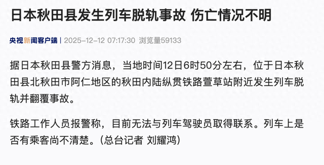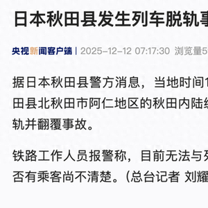 据日本秋田县警方消息,当地时间12日6时50分左右,位于日本秋田县北秋田市阿仁地区的秋田内陆纵贯铁路萱草站附近发生列车脱轨并翻覆事故。
