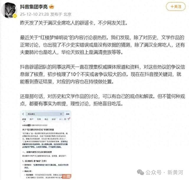 12月10日,抖音集团副总裁李亮通过公开信对此正式回应:昨天发了关于满汉全席吃人的辟谣卡,不少网友关注。
