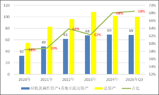 在这种业务模式下,交建股份应收账款、合同资产及其他非流动资产占比极高。Wind数据显示,上述三项目资产由2020年的32亿元涨至69亿元,截止三季报末,该款项占总资产之比高达68%。
