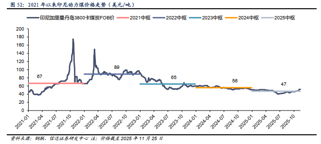 2025年印尼和澳洲动力煤中枢价格回落。截至2025年11月25日,印尼加里曼丹岛3800大卡煤炭均价为47美元/吨,较2024年均价56美元/吨下跌约9美元/吨,同比下降16%,2025年均价下降幅度较2024年小幅扩大。截至2025年11月25日,澳洲纽卡斯尔港5500大卡煤炭均价为72美元/吨,较2024年均价90美元/吨下跌约18美元/吨,同比下降20%,2025年均价下降幅度较2024年有所扩大。