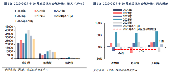 国内产量方面,分地域来看,2025年1-10月全国原煤产量同比增长1.5%,区域结构呈现“晋增新缓、陕稳蒙降”的特征,增长主力主要来自山西省的恢复性增产。