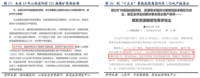 山西省煤炭减产起于安全监管,但不止于安全,更应当关注未来资源衰减带来的产量下滑态势。2024年1月,山西省自然资源厅在《山西省煤炭探矿权网上挂牌事项常见问题及解答》中提到“近十年内,我省将有约221座煤矿资源枯竭,影响年产能2亿多吨”。早在2022年山西省十三届人大六次会议上,山西省人大代表、晋能控股集团董事长就提出“十三五”期间,晋能控股集团关闭退出57座煤矿,减少产能7151万吨/年。当前到“十五五”,还有48座资源枯竭煤矿要退出,预计减少产能5290万吨/年;部分成本高、效益差的煤矿迎来重组或关闭,将减少产能4810万吨/年。”受煤炭资源禀赋条件恶化、煤炭资源量衰退、矿井开采成本上升等综合因素影响,我们认为山西省煤炭减产起于安全监管,但不止于安全,更应当关注未来资源衰减带来的产量下滑态势。