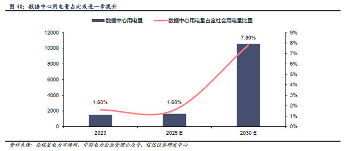 “十五五”期间数据中心用电量有望保持高速增长。人工智能用电直接体现为数据中心用电,《中国电力供需分析报告(2025)》中预计我国2025、2030年数据中心用电量将分别达到1637亿、10554亿千瓦时,占当年全社会用电量的比例分别达到1.6%、7.8%。“十五五”期间数据中心用电量年均增速有望达到45.2%。