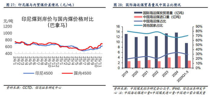 全球海运煤供给或已达平台期,叠加国际市场需求格局变化,制约我国煤炭进口上限。 2025年前三季度,国际海运煤贸易量为9.67亿吨(同比下降4.3%),按此节奏推算,全年总量约为12.89亿吨,将低于2024年的13.72亿吨。我们认为,全球煤炭贸易规模已触及阶段性顶峰,主要出口国如印尼受开采成本上升、澳大利亚受新增项目投产缓慢等因素制约,供给弹性不足,难以支撑我国进口量继续增长。另一方面,国际市场需求格局生变,印度、东盟等新兴经济体煤炭消费仍处高位,持续分流印尼等国的出口资源。与此同时,欧盟、日韩等传统进口区的减量空间已大幅收窄,难以像前几年那样为我国提供额外的进口增量空间。