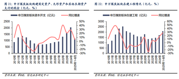 从上市公司资本开支结构来看,煤炭行业投资重心已明显向产业链下游延伸,新建煤炭产能有限,供给弹性持续受限。2025年1-9月,主要煤炭上市公司在建工程金额达2087亿元,同比增长28.2%,延续了自2021年以来的增长态势。从在建工程主要增加企业来看,中国神华、中煤能源、陕西煤业、兖矿能源、新集能源五家企业在建工程合计增加351亿元,成为主要贡献者。从上市公司来看,煤炭资本开支投资方向发生转变,除兖矿能源主要资本开支方面为煤炭产能外,其余公司资本开支主要投向煤电、煤化工等下游领域,直接用于新建煤炭产能的投资相对有限。产业链延伸投资特征反映出,在“双碳”目标背景下,煤炭企业积极向电力、化工等下游产业延伸,通过一体化经营增强抗风险能力。此外,新建煤矿面临审批严格、建设周期长、吨煤投资成本高等多重约束,也导致企业新建煤炭产能意愿相对谨慎。整体而言,当前资本开支增长并未指向煤炭产能的大规模扩张,反而印证了供给端释放面临的刚性约束。