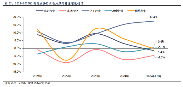建材行业动力煤消费量呈现持续下降趋势。建材行业动力煤消费量由2021年的3.2亿吨下降至2024年的2.7亿吨,2025年1-9月消费量为1.9亿吨,同比下降4.6%,仍维持下降态势。从同比增速来看,建材行业煤炭消费2021年以来持续负增长,消费持续收缩主要受下游房地产需求不振、产业结构调整与能效提升、环保政策约束等因素影响。我们预计,未来建材行业的煤炭消费量将延续震荡下行的态势。