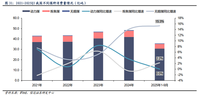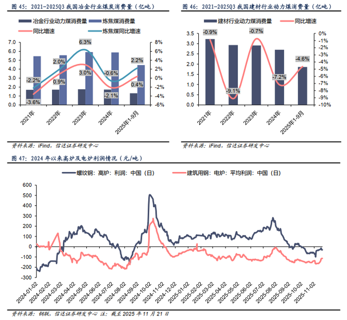 炼焦煤消费量波动增长,2025年增速由负转正。2021年以来,炼焦煤消费量波动增长,从2021年的5.5亿吨微增至2024年的5.9亿吨,2025年1-9月炼焦煤消费量为4.5亿吨,同比增长2.2%。冶金行业动力煤消费量2024年为1.7亿吨,较2021年保持平稳态势,2025年1-9月为1.3亿吨,同比微增0.4%。