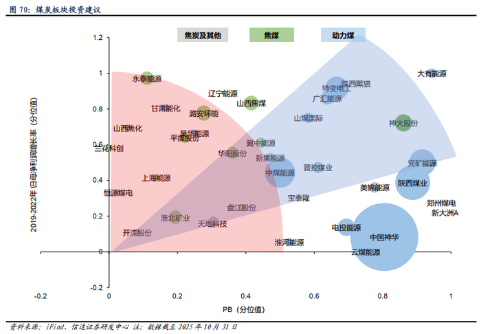 回顾2016-2018年及2020-2022年两轮行情,我们发现,行情初期率先上涨的标的主要分布于低估值、高成长性与中低估值、中小市值区间。而贯穿整轮上涨,累计涨幅较大的标的主要分布于兼具业绩成长性及估值性价比区间,标的市值以中型煤企为主,较率先上涨区间有所抬升。若PPI转正,特别是后续有相应需求端政策出台后,我们认为,煤种配置上重点关注炼焦煤,在过去两轮行情中焦煤上涨速度最快。个股选择方面,在不考虑公司自身的经营情况发生的重大改变,基于2020-2022年期间业绩成长性测算,我们认为,行情初期低估值高成长标的和中低估值小市值标的或率先上涨(下图红色区域);行情中后期,兼具成长性与性价比的中型估值标的或涨幅居前(下图蓝色区域)。