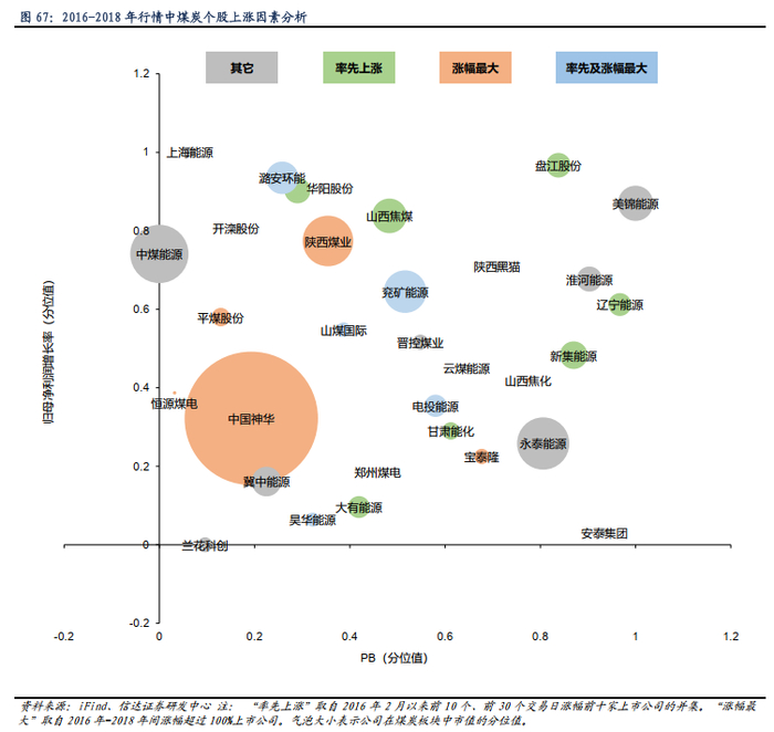 • 2016-2018年行情中,中小估值、成长性高的标的率先上涨,低估值标的涨幅较大。从估值、利润增长率、市值规模三个维度分析,在2016-2018年煤炭板块上涨行情中,率先上涨主要是中小估值、归母净利润增长潜力较高的煤炭上市公司,在区域分布上山西煤炭上市公司数量较多,华阳股份、山西焦煤、潞安环能、山煤国际均位于山西。在2016-2018年煤炭板块上涨行情中,涨幅最大主要是估值较低的煤炭上市公司,高市值、大体量公司占比较率先上涨标的中占比有显著抬升,中国神华、陕西煤业、兖矿能源等大市值标的涨幅均较高。