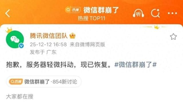 今天(12月12日)下午,不少市民和网友突然发现,微信群聊“失灵”了——消息发不出去,也无法正常接收。一时间,“微信群崩了”成为社交平台热议话题,相关词条迅速登上热搜榜。截至记者发稿前,微信功能已陆续恢复。