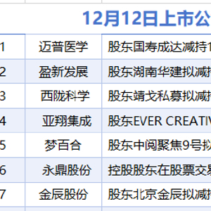 据统计,12月12日,盘后迈普医学、盈新发展、西陇科学、亚翔集成、梦百合、永鼎股份、金辰股份等7家A股上市公司披露减持情况。当日暂无上市公司披露增持情况。