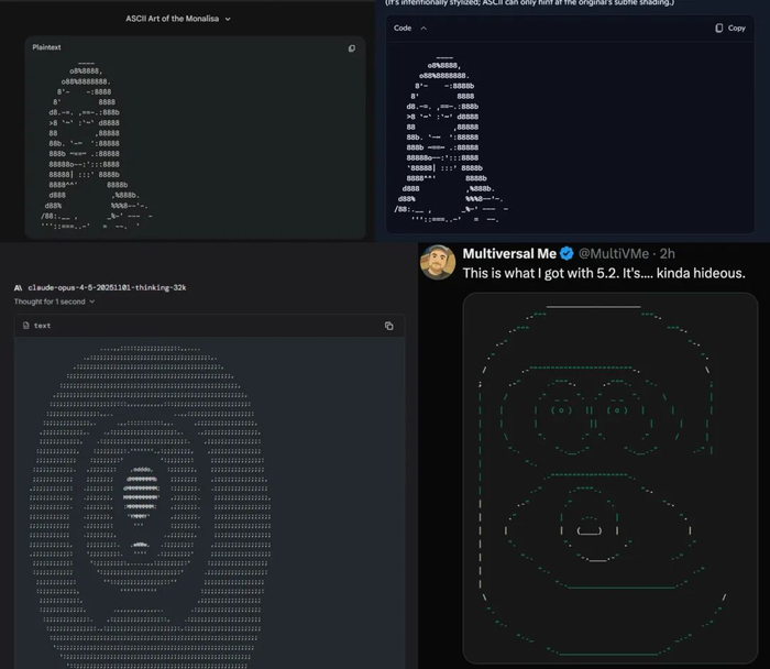 该网友还让 GPT-5.2 和 GPT-4o 创作蒙娜丽莎的 ASCII 艺术作品,GPT-5.2 整的那叫一个抽象,而 GPT-4o 还真有些蒙娜丽莎的神韵。