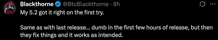 总之,GPT-5.2 的回答很不稳定,有的回答正确,有的胡说八道。有网友推测,和上个版本一样…… 发布后的头几个小时确实很糟糕,但之后他们会修复问题,然后就能按预期运行了。