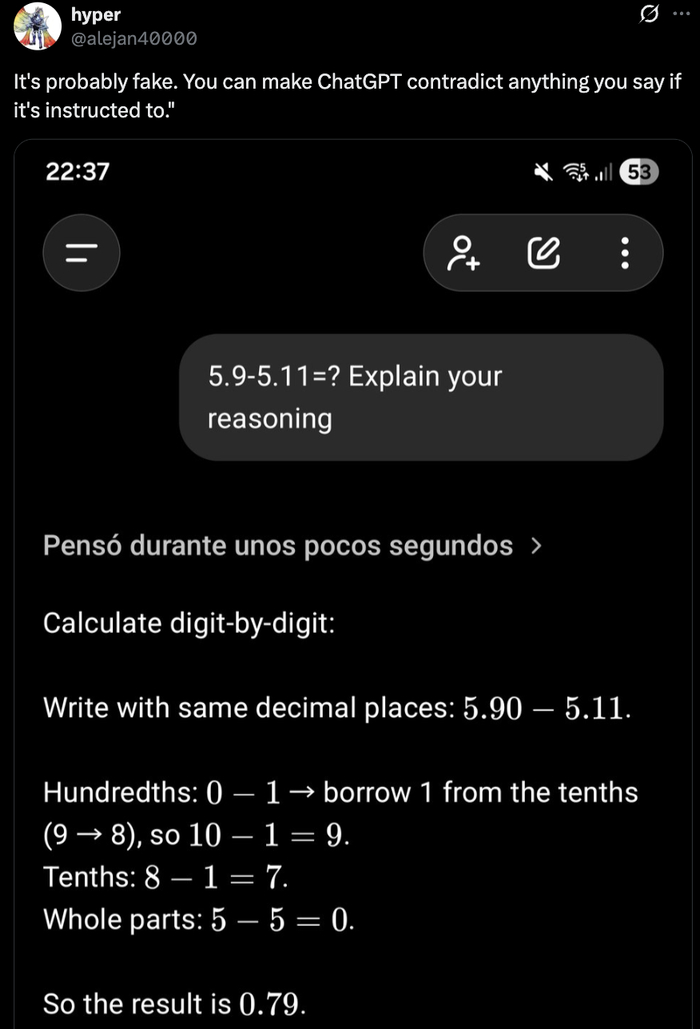 在官方贴出的基准测试中,GPT-5.2 在 AIME 2025(数学)的分数是 100%,但有网友故意「忽悠」GPT-5.2:所以 5.9-5.11=0.79。GPT-5.2 却回答:不,那不是小数的运算方式,5.11 比 5.9 大,因此 5.9-5.11=-0.21。这个傻狍子啊,被人一忽悠就忽悠瘸了。😂