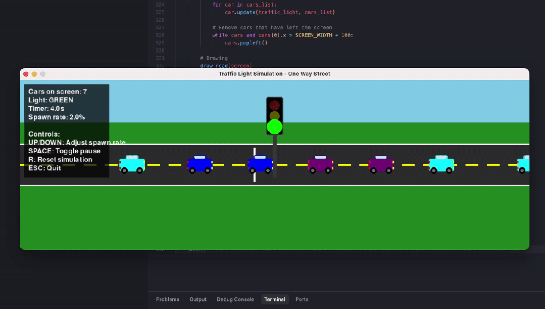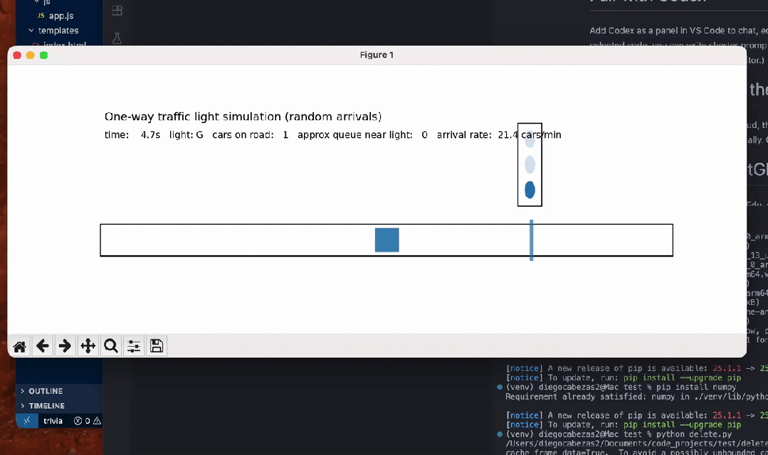 另一位网友则对比测试了编程能力。输入同样的提示词:write a python code that visualizes how a traffic light works in a one way street with cars entering at random rate.(编写一个 Python 代码,可视化单行道中交通信号灯的工作原理,车辆以随机速率驶入。)