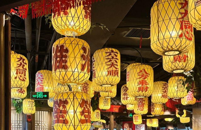 那时候还没流行“沉浸式”消费,而这里率先尝试,未进门,先闻声。穿长衫的堂倌立在门外,见客来,便拖长了调子吆喝一声:“二位——里——面——请——哟!”这声调不像喊,倒像唱,带着些江南的糯,又掺了点江北的爽利,尾音悠悠地往上扬,像把钩子,轻轻巧巧就把人勾进了另一个年月。店里是另一番天地。楹联灯幌,一色的昏黄;灰砖木窗,沉淀着旧影。八仙桌、长条凳,挤挤挨挨,人声嘈嘈,却不觉烦嚣。顶上悬着好些黄澄澄的灯笼,光晕暖暖地洒下来,笼着桌上的杯盘碗盏,也笼着食客们油光光的笑脸。墙角倚着块匾额,据说是从民间淘换来的老物件,木纹里都藏着故事。