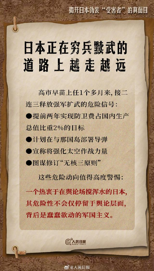 以“受害者”为借口发动侵略战争、用“受害者”谎言炮制虚假叙事、以“受害者”身份翻案历史突破现状…日本正在穷兵黩武道路上越走越远,这些危险动向值得高度警惕:一个热衷于在舆论场搅浑水的日本,其危险性不会仅停留于舆论层面,背后是蠢蠢欲动的军国主义。