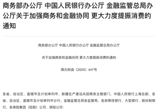 强化商务和金融系统协作,助力提振和扩大消费。重磅文件来了!