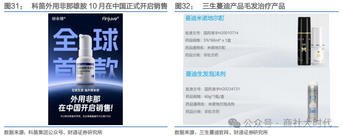 防脱治疗:中国毛发治疗市场正展现出巨大的增长潜力,灼识咨询预计中国头发健康管理市场呈持续增长态势,2018-2024年市场规模从198亿元增至527亿元,复合年增长率17.7%,脱发药物治疗市场增长更为迅猛,2018-2024年规模从5 亿元增至35亿元,复合年增长率高达39.9%。市场竞争格局呈现创新活跃态势,企业主要围绕经典药物迭代和创新药研发两大方向展开布局。(1)科笛集团于 2025年6月获批CU-40102(外用非那雄胺喷雾剂),通过降低全身药物暴露为患者提供更安全的选择,其核心价值围绕“机制精准、剂型创新、安全性优”三大特点展开,10月20日在中国正式开启销售。(2)蔓迪国际计划推进港股IPO,其核心产品蔓迪®米诺地尔连续十年保持市场领先地位,2024年推出的5%米诺地尔泡沫剂上市首年销量突破250万瓶。在技术进步与消费意识提升的双重推动下,从传统药物到新型制剂的产品创新正持续推动市场扩容,为行业创造长期增长空间。