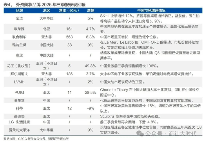 格局重塑+需求回温,高端外资美妆回暖。2025年第三季度,以SK-II、海蓝之谜、莱珀妮等为代表的高端美妆表现亮眼,其中SK-II大中华区业绩增长12%,欧莱雅内地销售在第三季度加速至中个位数增长,LVMH同比增速转正,整体外资美妆品牌表现回暖,我们认为核心原因有二:1)中国及东南亚等新兴市场凭借庞大的人口基数、细分结构性消费需求提升以及日益成熟的消费观念,为外资美妆巨头带来机会,外资美妆品牌对中国市场愈发重视并主动加大资源投入,如雅诗兰黛2025年2月将中国内地单独设为集团四大板块之一(此前归入亚太区),资生堂提出“重建中国可持续商业基础”计划。2)电商大盘美妆类目增速较线下渠道存在相对优势,平台端出于扩大规模、提升ROI以及战略价值等多维度考虑,选择扶持客单更高、品牌力强、用户信任度高的外资美妆品牌,助力平台获取更高的单位流量价值和长期竞争力。