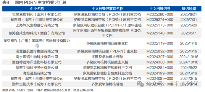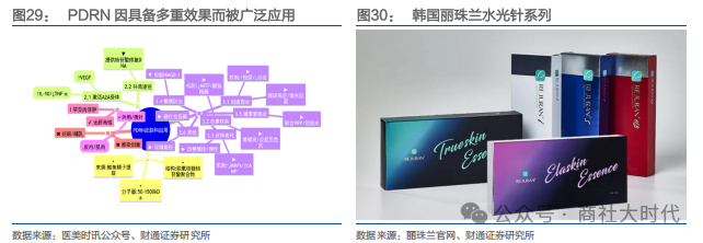 PDRN(三文鱼针):PDRN(多聚脱氧核糖核苷酸)提取自三文鱼(鲑鱼), 因其可通过与腺苷A2A受体结合,有效促进成纤维细胞增殖,加速胶原蛋白合成,从而达成抗炎、改善色素沉着、促进组织再生及强效抗衰老的多重功效。韩国、日本及部分欧盟国家已建立鲑鱼源PDRN在医美及非处方产品的审批先例。 在国内,华熙生物、江苏吴中、乐普医疗等逾20家企业已切入PDRN研发与生产领域,其中乐普医疗的PDRN水光针(三文鱼针)已完成临床前动物实验,计划于 2026 年一季度推出国内首款PDRN水光针,2026年销售目标 2 亿元,与童颜针、水光针等产品共同构建多元化医美产品矩阵。