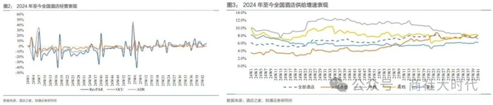 出行表现较好下,ADR转正带动RevPar修复,OCC受供给扩张仍有压力。从全国酒店的经营表现来看,今年下半年以来,酒店行业的ADR同比持续转正,带动RevPar有所修复,下半年以来酒店行业RevPar整体维持在同比正增长水平。我们认为下半年以来ADR表现较好主要受益于出行需求旺盛带动。从OCC来看,受到全年供给仍在增加的影响,OCC整体仍然保持同比下滑的态势。从供给来看,今年以来,全国中档、高档酒店供给增速环比有所下降,经济型酒店扩张环比加速,豪华酒店供给增速维持稳定。展望明年,我们预计酒店供给增速将维持稳定,随着需求侧逐步转好,酒店行业RevPar有望持续改善。