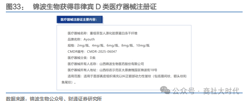 开拓海外市场、寻找第二增长曲线,已成为上游厂商寻求增量的共识性战略。国内企业正凭借成熟的再生材料研发体系、高性价比的供应链能力及合规审批经验, 逐步在东南亚、拉美、欧洲等新兴市场占据一席之地。以锦波生物为例,其重组 胶原蛋白医疗器械已成功在越南、泰国、菲律宾获批;在认证端,旗下功能性护 肤品先后获得美国 FDA 和沙特阿拉伯认证,为未来进军高端市场打下基础;在 合作端,公司与欧莱雅在原料端达成合作,并携手四川大学主导相关国际标准的 立项,争夺行业话语权。此外,摩漾生物 Aphranel®优法兰已成功获得欧盟 MD、 MDSAP及墨西哥COFEPRIS等国际权威认证。中国医美产品在攻克海外合规 认证与品牌认知度难题的同时,通过本土化营销与高端化创新逐步渗透全球市场, 成为中国医美产业从本土领先向国际竞争升级的核心抓手。