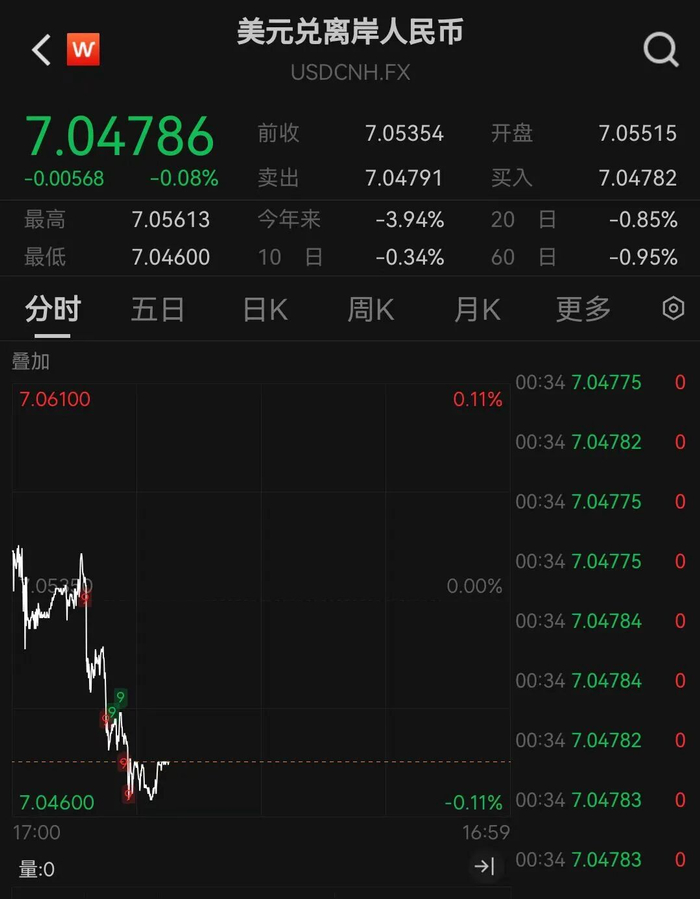 在岸、离岸人民币对美元双双创下14个月以来新高,离岸人民币对美元一度升至7.0460,在岸人民币升至7.0497。