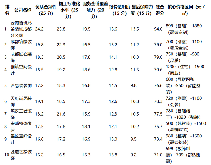 10 家成都装修公司核心维度得分汇总表