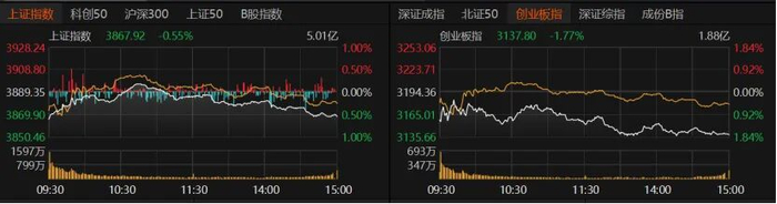 指数方面,沪指早盘低开翻红,午后跳水,收跌0.55%,报3867.92点;创业板指全天弱势,收跌1.77%;科创50低开低走,收跌2.22%;北证50午后加速下行,跌幅逾1%;沪深300、上证50微跌。