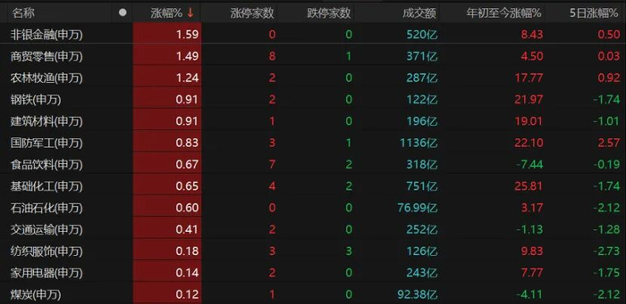 板块显著分化,非银金融、商贸零售、农林牧渔、钢铁、建筑材料、食品饮料等收涨。