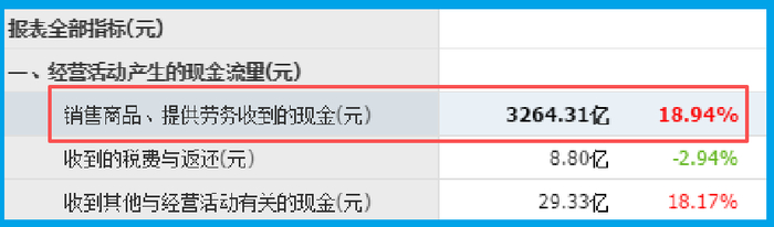 然而,翻到现金流量表,故事的画风突变。销售商品收到的现金高达3264.31亿元,同比增长18.94%,几乎与营业收入相当。