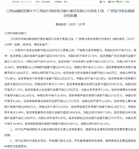 12月16日金融一线消息,江西金融监管局发布关于江西农村商业联合银行股份有限公司参股上饶、广信等19家农商银行的批复,同意江西农商联合银行投资总金额不超过220475万元参股上饶、广信等19家农商银行,持股比例均不低于5%。