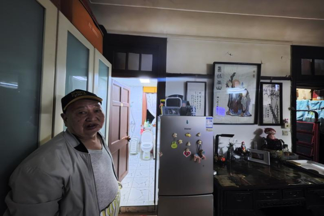 愚园路1407弄小区居民李老伯站在自家改造完成的独用卫生间门口。愚园路1407弄延陵邨小区是无法大拆大建的风貌保护街区。通过抽户改造方式解决“拎马桶”难题(2025年10月23日摄)。新华社记者方喆摄