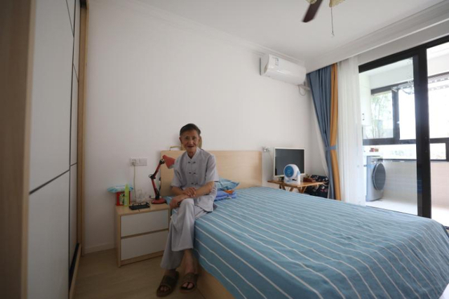 彭三小区五期居民陆老伯坐在新房床边,他的住房由改造前的7平方米增加到28平方米,陆老伯很高兴(2022年7月21日摄)。新华社记者方喆摄