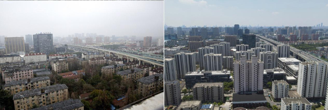 拼版照片:左图为上海静安区彭一小区非成套旧住房改造项目工地(无人机照片,2023年5月25日摄);右图为该项目建成后的景象(无人机照片,2025年2月28日摄)。新华社记者方喆摄